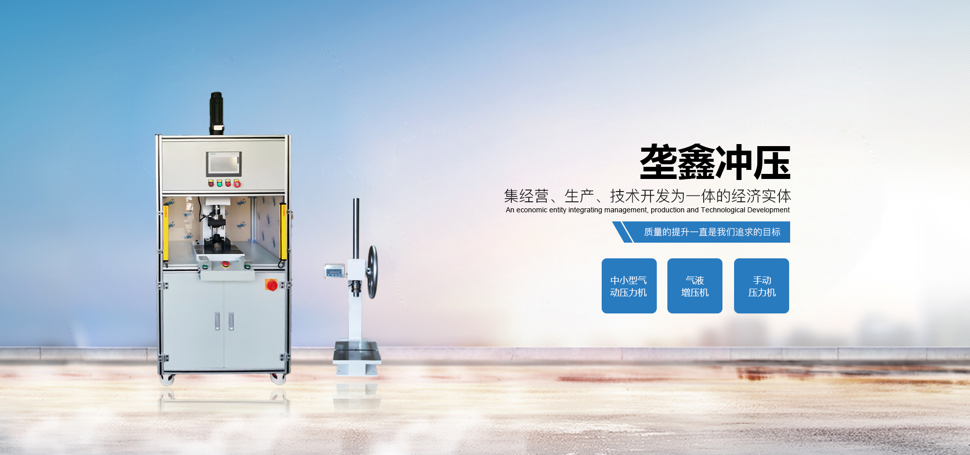 煙臺壟鑫沖壓設(shè)備有限公司是集經(jīng)營、生產(chǎn)、技術(shù)開發(fā)為一體的經(jīng)濟(jì)實(shí)體,專業(yè)致力于中小型壓力機(jī)、非標(biāo)壓力機(jī)的設(shè)計開發(fā)和制造。在引進(jìn)德國、日本等國家先進(jìn)的鉚壓控制技術(shù)及機(jī)器設(shè)計理念的基礎(chǔ)上,結(jié)合相關(guān)行業(yè)的實(shí)際需要,開發(fā)出各種臺式、落地式氣動壓力機(jī)、手動壓力機(jī)、氣液增壓機(jī)、氣液增力缸、旋鉚機(jī)、無鉚釘鉚接機(jī)等鉚接設(shè)備。產(chǎn)品應(yīng)用領(lǐng)域廣泛,適用于汽車零件、電子、電器、家電、包裝、五金、等行業(yè)。公司視質(zhì)量為生命,并一貫遵循對每一臺產(chǎn)品負(fù)責(zé),對每一位用戶負(fù)責(zé),真誠為您服務(wù)。 自公司成立以來,秉承“誠信,創(chuàng)新,專業(yè)”的經(jīng)營理念,以優(yōu)質(zhì)的產(chǎn)品,完善的售后服務(wù),樹立良好的品牌形象,服務(wù)于廣大新老顧客。我們竭誠于各位同仁攜手并進(jìn),共謀發(fā)展。